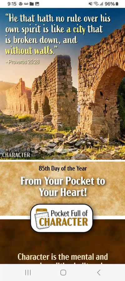 Just as Nehemiah and his followers rebuilt the walls of Jerusalem, we too must recognize that walls can be torn down and need to be rebuilt. If you complete the first round, continue using Pocket Full of Character daily or weekly as a way to not only build or rebuild but also maintain and preserve those walls. This will help keep our hearts, decisions, actions, and attitudes pure and upright.